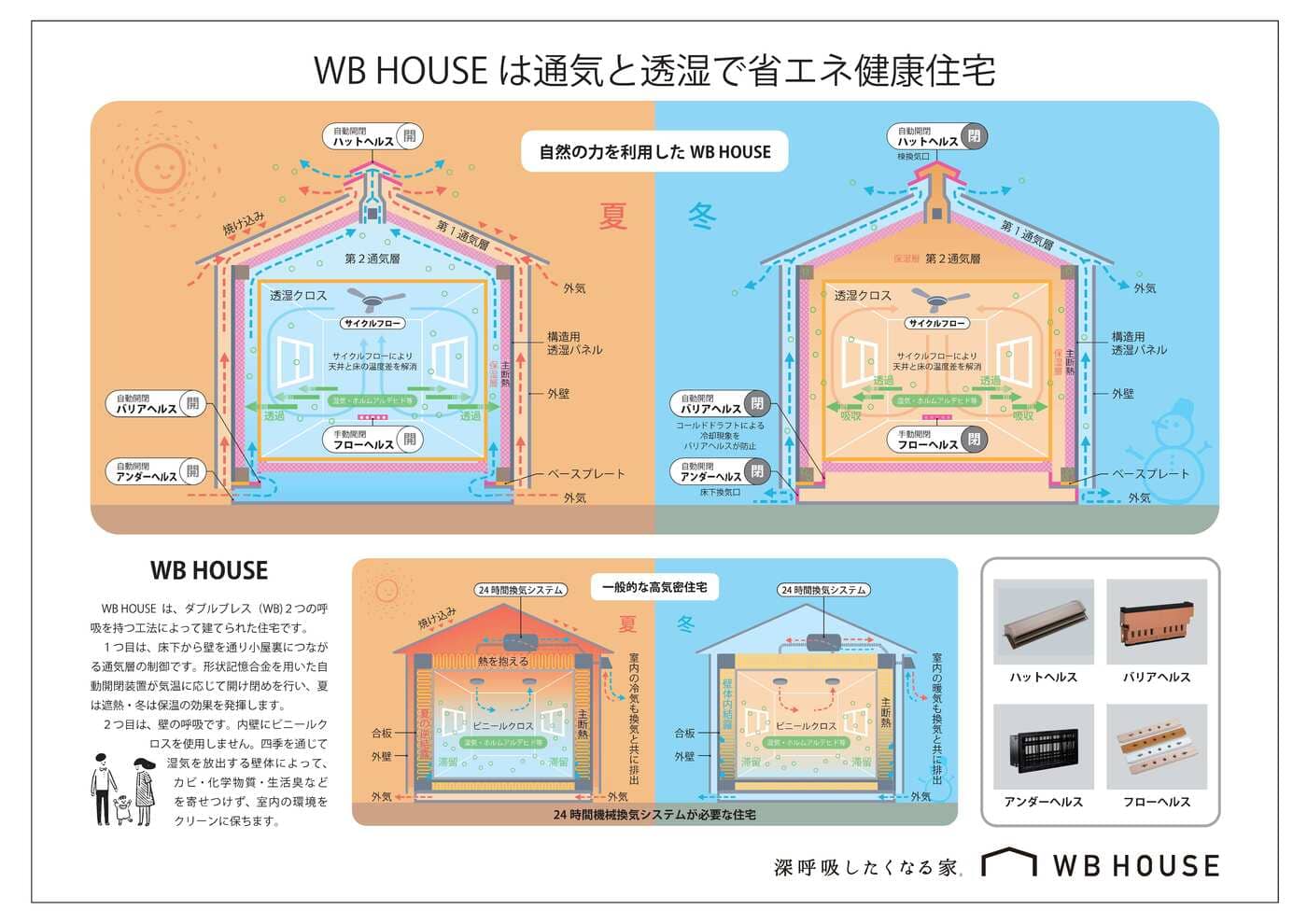 WB工法概念図:夏は熱気を排出し涼しく、冬は暖気を保持して暖かく